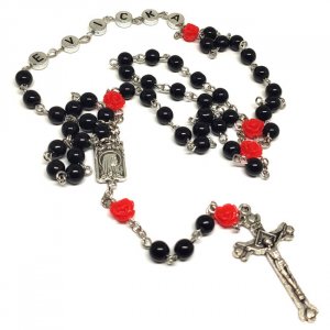 Náhrdelník ruženec, ktorý je pospájaný imitáciou perál čiernej farby a červenými ružičkami. V spodnej časti ruženca je upevnený krížik Ježiša Krista. Podľa želania Vám vieme vyrobiť ruženec aj na mieru podľa zvolených korálok, ktoré si vyberiete. Na jeden ruženec je možné vyrobiť vždy iba jedno meno alebo meno s číslicami podľa typu korálok.