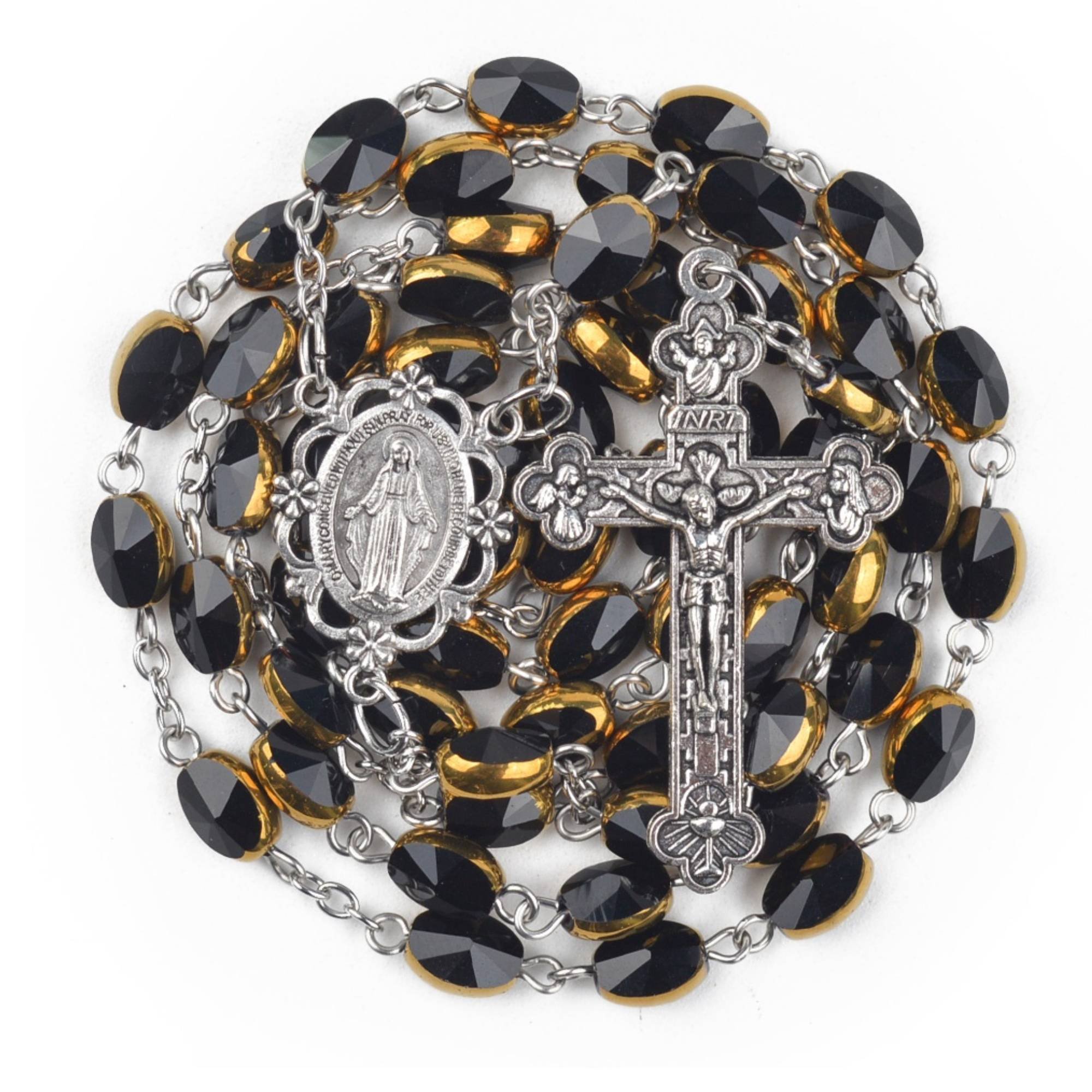 Ruženec, pospájané čierne zrnká so zlatým lemovaním. V spodnej časti ruženca je upevnený krížik Ježiša Krista. Podľa želania Vám vieme vyrobiť ruženec aj na mieru podľa zvolených korálok, ktoré si vyberiete. Na jeden ruženec je možné vyrobiť vždy iba jedno meno alebo meno s číslicami podľa typu korálok.