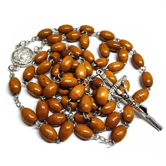 Ruženec, pospájané drevné korálky hnedej farby. V spodnej časti ruženca visí krížik Ježiša Krista. Podľa želania Vám vieme vyrobiť ruženec aj na mieru podľa zvolených korálok, ktoré si vyberiete. Na jeden ruženec je možné vyrobiť vždy iba jedno meno alebo meno s číslicami podľa typu korálok.