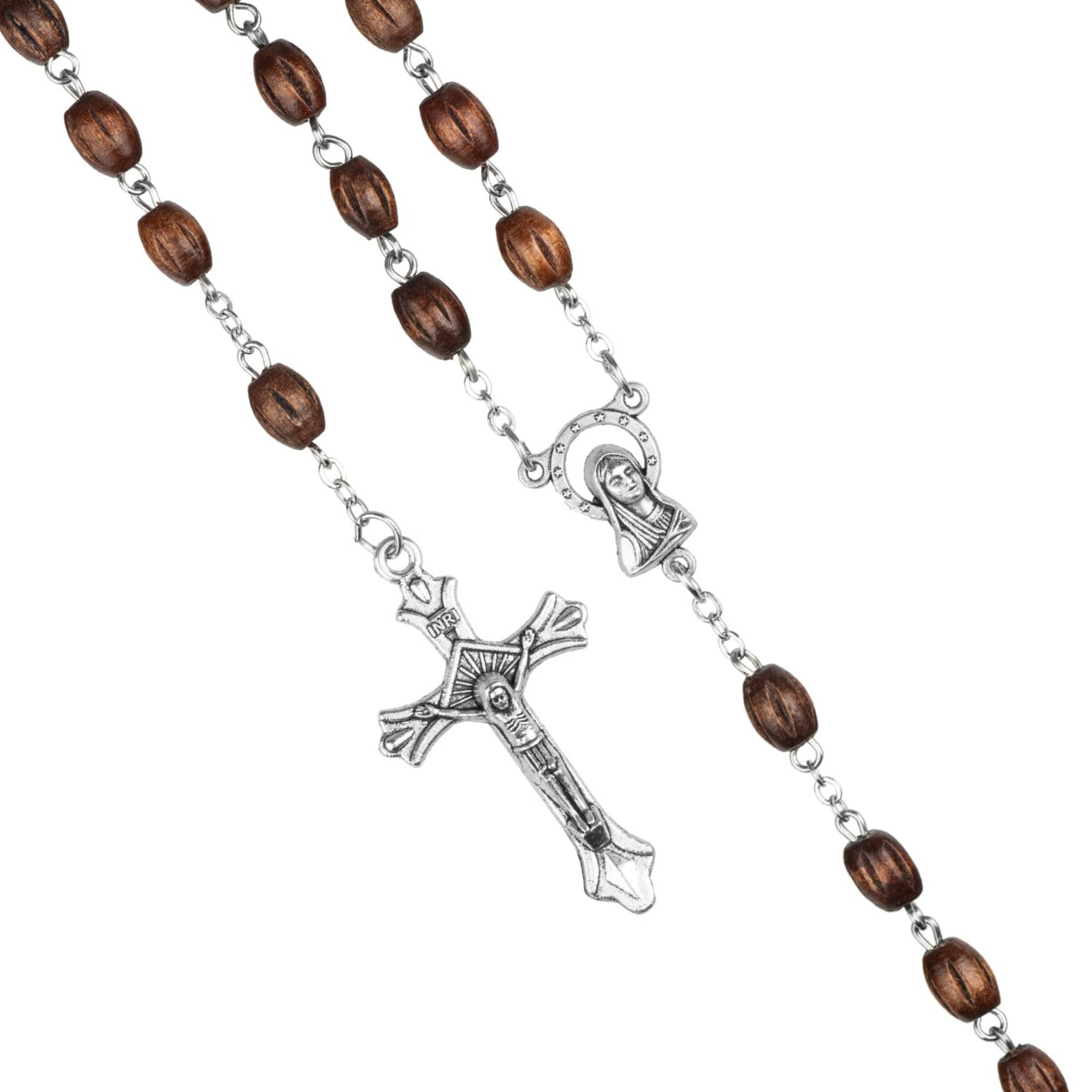Ruženec, pospájané drevné korálky tmavohnedej farby. V spodnej časti ruženca visí krížik Ježiša Krista. Podľa želania Vám vieme vyrobiť ruženec aj na mieru podľa zvolených korálok, ktoré si vyberiete. Na jeden ruženec je možné vyrobiť vždy iba jedno meno alebo meno s číslicami podľa typu korálok.