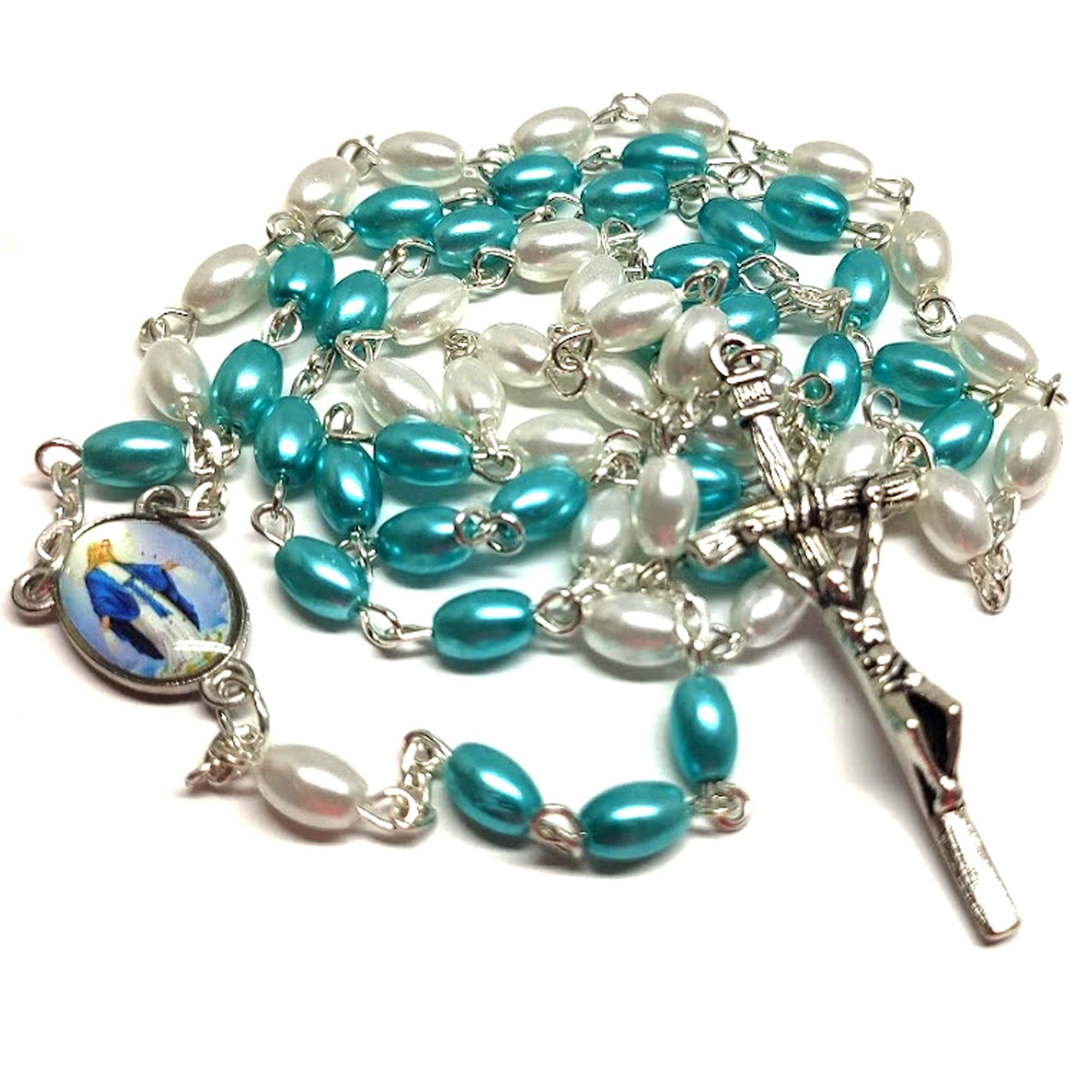 Ruženec, pospájané syntetické perly tyrkysovej a bielej farby. Z ruženca visí medailón Zázračnej Panny Márie a krížik Ježiša Krista. Podľa želania Vám vieme vyrobiť ruženec aj na mieru podľa zvolených korálok, ktoré si vyberiete. Na jeden ruženec je možné vyrobiť vždy iba jedno meno alebo meno s číslicami podľa typu korálok.