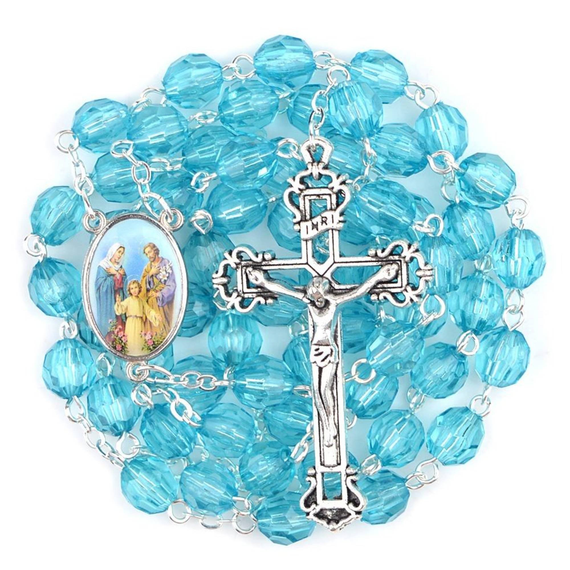 Ruženec, ktorý je pospájaný krištáľovými korálkami modrej farby. V spodnej časti ruženca visí medailón svätej rodiny a krížik Ježiša Krista. Podľa želania Vám vieme vyrobiť ruženec aj na mieru podľa zvolených korálok, ktoré si vyberiete. Na jeden ruženec je možné vyrobiť vždy iba jedno meno alebo meno s číslicami podľa typu korálok.